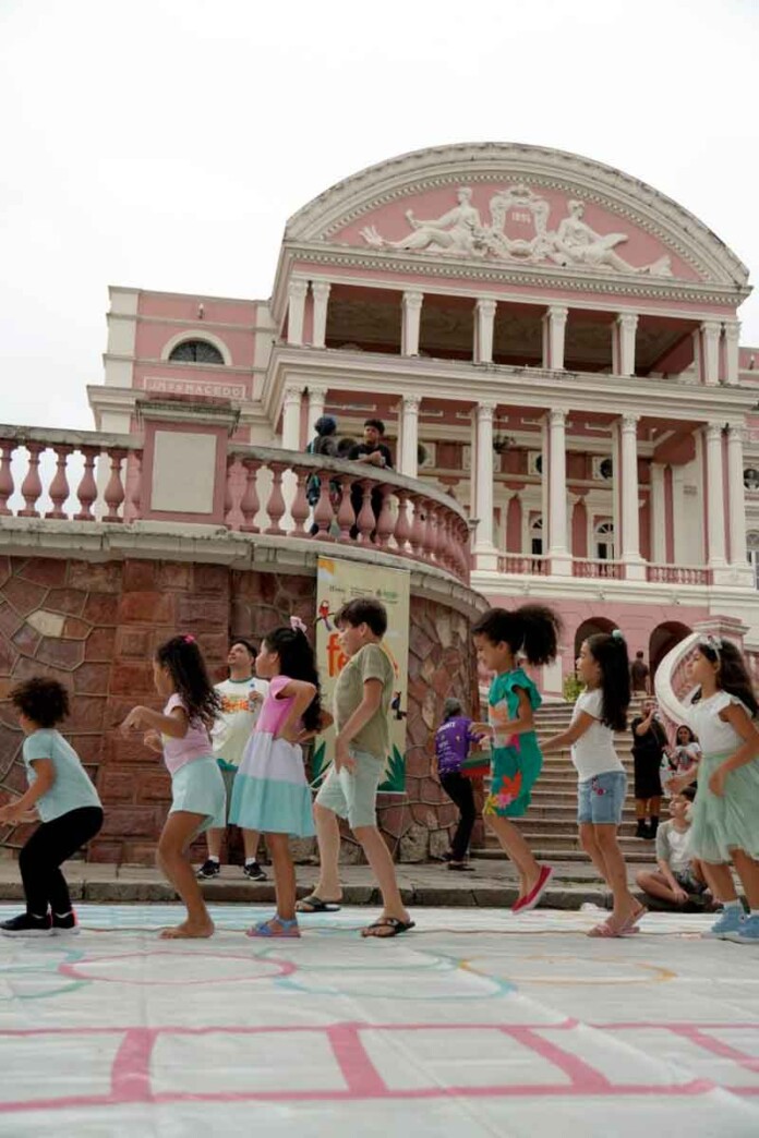 O Centro Histórico de Manaus ganhou um brilho especial na tarde deste sábado (17/01). A Secretaria de Estado de Cultura e Economia Criativa (SEC-AM) realizou o segundo dia do “Festival de Férias 2026”, ocupando espaços icônicos como o Teatro Amazonas, a Galeria do Largo e o Largo de São Sebastião. Entre 17h e 20h, o público mergulhou em uma programação que uniu a grandiosidade dos nossos monumentos com a leveza das brincadeiras de rua, provando que a cultura e o lazer podem caminhar de mãos dadas para todas as idades.