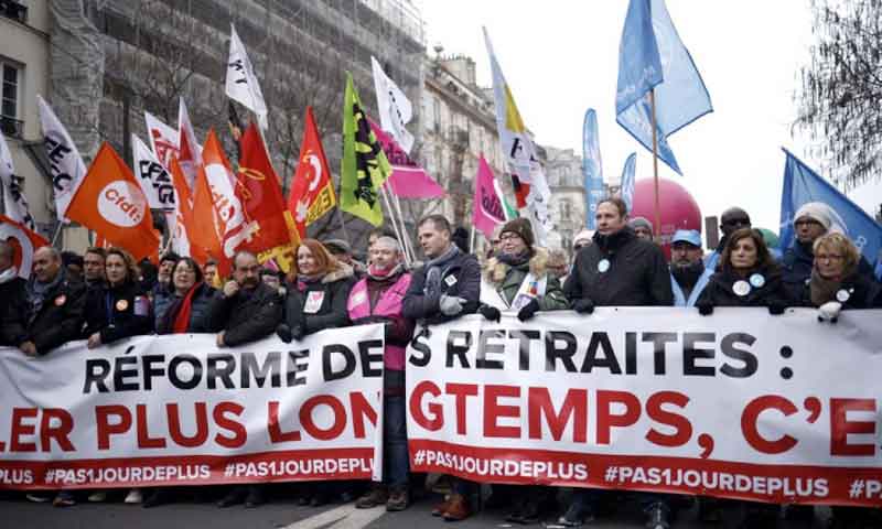 Sindicalistas franceses marcham atrás de uma faixa com os dizeres ‘Reforma das pensões, nem mais um dia’ durante uma greve nacional contra a reforma do sistema previdenciário – Foto: EFE/EPA/YOAN VALAT