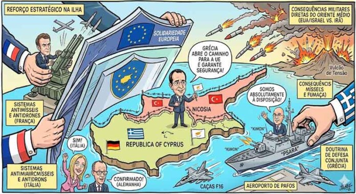 A ilha de Chipre começou a sentir as primeiras consequências militares diretas na Europa após os recentes bombardeios dos Estados Unidos da América (EUA) e de Israel contra o Irã. Diante da ameaça real de escalada, potências europeias como Grécia e França agiram rápido e decidiram enviar navios de guerra e sistemas antimísseis para proteger o território cipriota, que vive dividido desde a invasão turca em 1974.