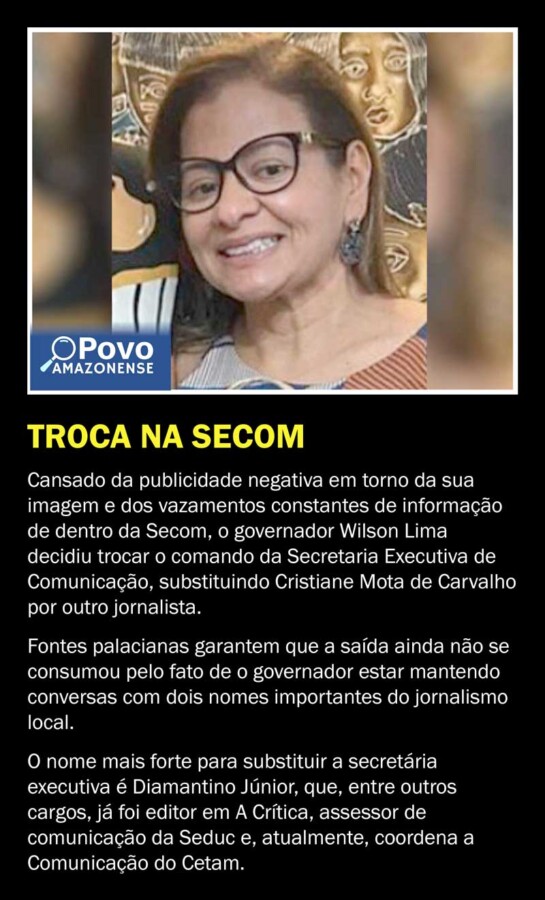 - Nos bastidores, comenta-se que a relação entre Wilson Lima e Cristiane Mota de Carvalho já estava insustentável há muito tempo e que a gota d’água foi o crescimento da impopularidade do governador, que está com índice de rejeição beirando a casa dos 70%, apesar de haver uma equipe na Secom com mais 65 profissionais de comunicação de primeira linha, entre repórteres, editores, produtores, radialistas, fotógrafos e cinegrafistas.