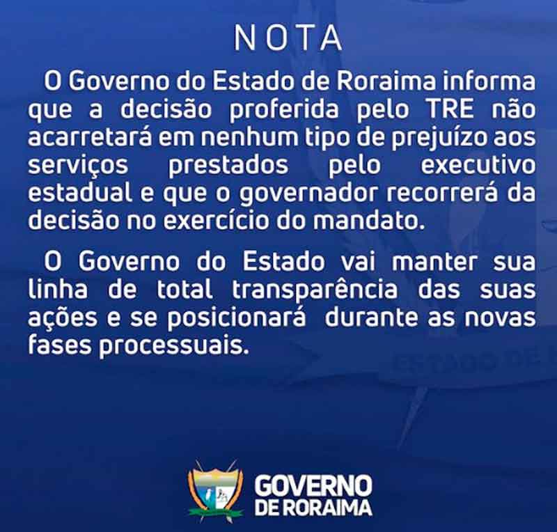 - O governo de Roraima publicou que “a decisão proferida pelo TRE não acarretará nenhum tipo de prejuízo aos serviços prestados pelo executivo estadual”. Leia a nota: