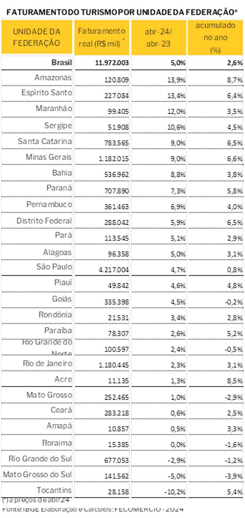 FATURAMENTO DO TURISMO POR UNIDADE DA FEDERAÇÃO | Abril de 2024