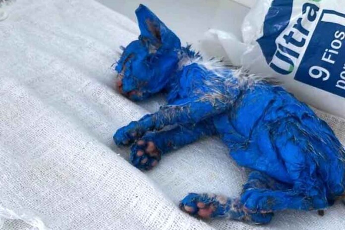 Blue foi encontrada em estado crítico no dia 23 de setembro de 2023, no bairro Santa Etelvina, na Zona Norte de Manaus. Ela estava completamente coberta por tinta óleo azul, com poucas ou quase nenhuma chance de sobrevivência, uma vez que a tinta em seu focinho dificultava a respiração.