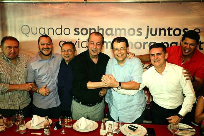 Líderes políticos de destaque, como o prefeito de Manaus, David Almeida (Avante), e o senador Omar Aziz (PSD), participaram de uma confraternização promovida pelo senador Eduardo Braga (MDB) em Manaus, na noite de sábado (14). O evento reuniu prefeitos, parlamentares e outros representantes para fortalecer parcerias e discutir projetos para o Amazonas. Outros líderes presentes incluíram Átila Lins (PP), Adail Filho (Republicanos), Saullo Vianna (União Brasil) e Sidney Leite (PSD).