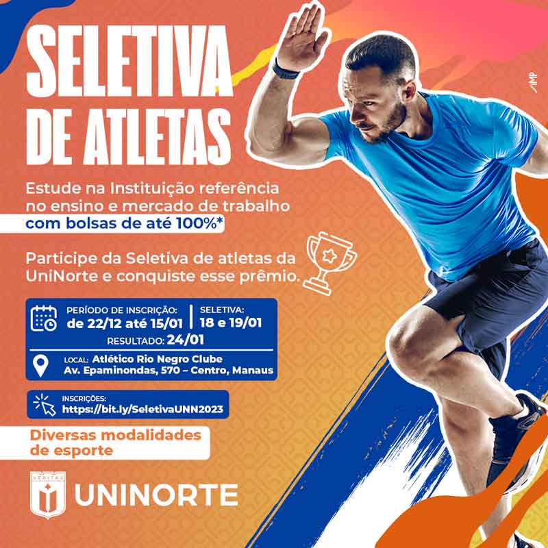 Estão abertas as inscrições para a seletiva de atletas do UNINORTE – Centro Universitário do Norte. Os candidatos irão concorrer a bolsas de até 100% de desconto para os cursos de graduação ofertados pela instituição de ensino. Para participar, o atleta deve se inscrever por meio do link bit.ly/SeletivaUNN2023 até o dia 15 de janeiro.