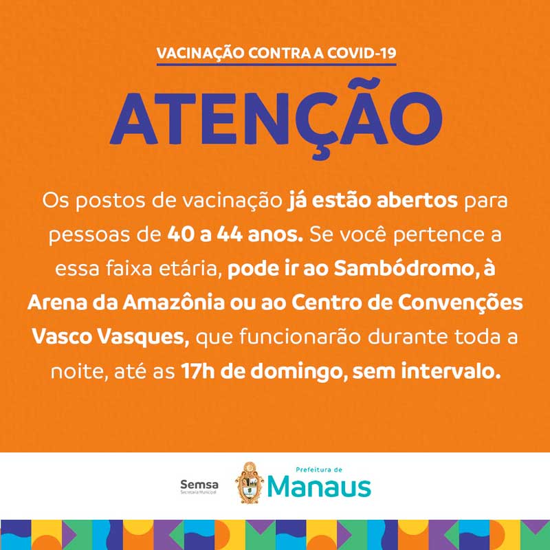 ManausSaúde Virada da Vacinação em Manaus, já estão abertos os postos de vacinação para pessoas de 40 a 44 anos Por Redação - 12 de junho de 2021
