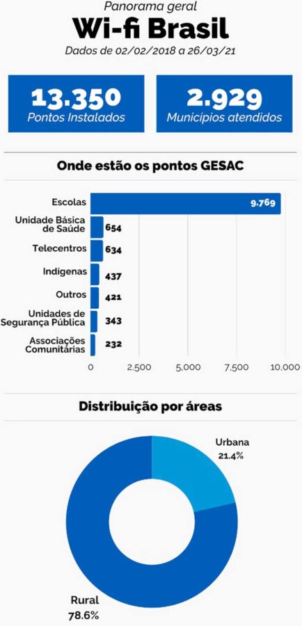 Hoje o programa conta com mais de 13,3 mil pontos de internet em funcionamento, instalados em escolas, unidades de saúde, de segurança e de prestação de serviços públicos em áreas remotas, de fronteira ou de interesse estratégico, além de aldeias indígenas e comunidades quilombolas – todos lugares de difícil acesso.